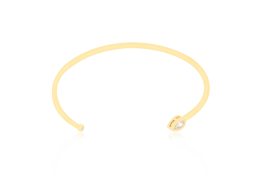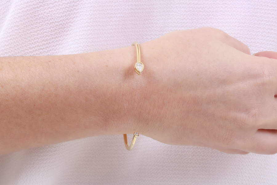 BRACELETE BANHADO EM OURO, COM 1 ZIRCÔNIA GOTA E 1 REDONDA, ABERTO